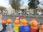 「僕のお兄ちゃん!」「がんばれー」「あとちょっと!」キラキラポンポンを持ち、大きな声で応援しました。お兄ちゃん・お姉ちゃんも幼稚園の子たちの声援を受けて、張り切って走ってくれましたよ。