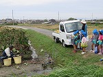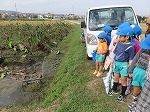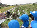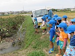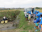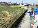 エビイモ・枝豆・お米の収穫を見せてもらいました。「これは、エビイモなんやけど小さいから“こえびちゃん”って言うんだよ。」「これはセミって言うねん。セミが木にとまっているみたいに見えるやろ!」「京田辺はエビイモが名産だよ」と教えてもらって興味津々でした。「がんばってね」と声をかけていました。