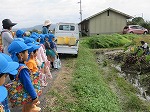 帰り道…「おかえり!」とエビイモを見せてくださった地域の方が声をかけてくださり、「ただいま~!」「こんな本借りてきた!」と見せる場面も(^^♪「もう一回セミのエビイモ見せて!」と頼んで見せてもらいました。「1年生になったら、給食でエビイモでるから食べてや~」と言ってくださいました。きっとこの経験は、小学校になっても思い出すと思います。地域の方々に見守っていただき、支えていただいて子どもたちはこの地域で大きくなっています。ありがとうございます。地域の自然、人とのつながりのあたたかさを感じられた一日でした。