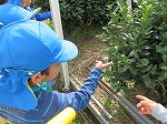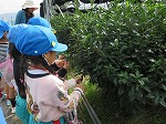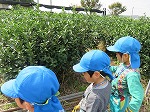 お茶畑もじっくりと見せてもらいました。「この黒い覆いを見たことがある人?」「はーい!」「もうすぐお茶の花が咲きそうだね」「この上の柔らかい葉っぱだけを摘むんだよ」「お母さん、お茶摘み行ってた」先生やお友達との会話が弾みます。