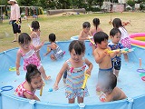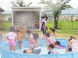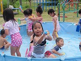 雨あがりにおひさまが。さあ、水遊び解禁です。みんな水着に着替えてうきうき。