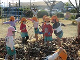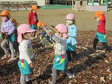 園庭の真ん中にたくさんの袋があるよ。「それなあに?」「わあ、葉っぱだらけ!」せっかくだから落ち葉で遊ぼう!
