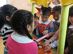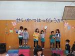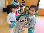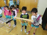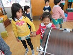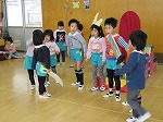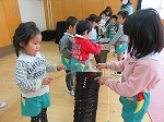 生活発表会は終わりましたが、まだまだ劇遊びや楽器遊びは続いています。「今日は○○役したい!」「私はウサギになる!」など、毎日役を交代して遊んでいます。「年長さんの楽器したいなー」「教えてほしいなー」ということで、今日はみんなで“発表会ごっこ”をしました。