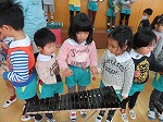 「こうやって鳴らすんだよ」「ここ!」「じょうず~」優しく教える年長さんの姿に成長を感じました。ちびっこ先生がいっぱいで、年少・年中のお友だちも嬉しそうでしたよ!