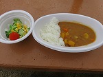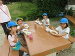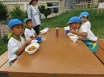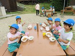 たくさん遊んだ後は、待ちに待った夕食の時間!4歳児の時に育てた玉ねぎとジャガイモの入ったカレーや、4歳児のすみれ組さんが育て分けてくれたキュウリのサラダに「おいしい!」「サイコー!!」と喜んで食べ、園で収穫した野菜の入ったご飯と外で食べるご飯においしさも倍増したようです。