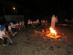 少しずつ日が沈み、さあ、キャンプファイヤーの始まりです。友達と一緒に手品や〇✖クイズ、ダンスの出し物を披露したり、先生の楽しい出し物を見たりして、楽しいひと時を過ごしていると、素敵なお客様の登場♪火の国から来てくれた火の神様が薪に火をつけてくれ、燃え上がる炎に子どもたちは「すごいね」「暗かったのに明るくなった」と話しながら、じーっと見つめていました。