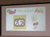 大きなスクリーンで、「ゆっくりよくかみ おおかみくん」「京田辺のヒーローぎょくろマン」のお話を聞き、よく噛んで食べることの大切さや、京田辺市の特産品について、食べることで力が湧いてくることを教えてもらいました。