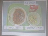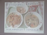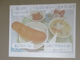 4月からは小学校で給食を食べるゆり組さんのために給食メニューの紹介もしてもらいました。「おいしそう~!」「これ食べたことある!」と、興味津々でした。