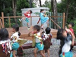 待ちに待ったキャンプファイアー。今までグループで練習してきた出し物をみんなの前で発表しました。《こわい話》チーム!!「キャーこわいよ~」耳ふさぐお友だちもたくさんいました。