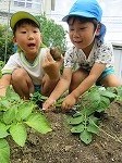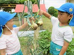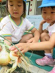 年長ゆり組が昨年度植えて、水やりや草抜きなどのお世話を頑張ってきた玉ねぎとじゃがいもが収穫の時期を迎えました。毎日お世話し生長を感じていただけに、収穫の喜びはひとしおです。