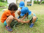 「玉ねぎはこうやって縛ってつるして干しておくともっと甘くておいしくなるんだよ」と先生に教えてもらってやってみました。何事も経験です。うまくいかず何回もチャレンジする姿も見られました。