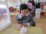 3日を迎えるまでに、飾っていたお花を見て、はじめは「さくら?」「うめ?」など、いろいろなお花の名前をつぶやいていましたが、先生に聞いたり絵本を読んだりして、ひなまつりの行事について詳しくなっていた子どもたちです。