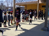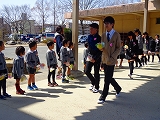 卒業おめでとう。遊んでくれて有り難う。手作りブーケをどうぞ。4歳児すみれ組のこどもたちが式を終えた6年生にプレゼントしました。また中学校へ会いに行きます。