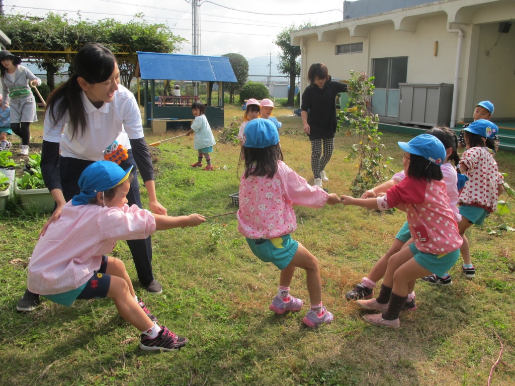 つなひき、なわとび、頭に飾って体にまいて、つるで作ったタンバリン!