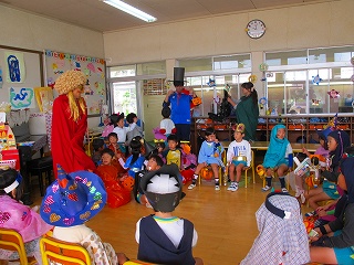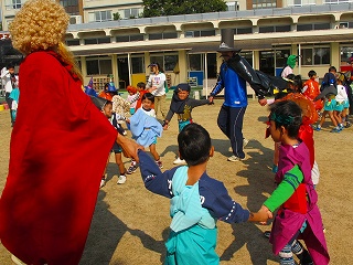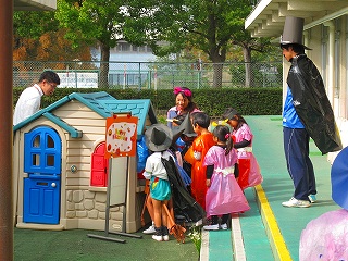 収穫に感謝してお祭りごっこ開始。お菓子を捜して園内を歩き回ると何とカエルくん
