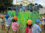 手足にぬったり、ジャングルジムに立てかけたダンボールのキャンバスに