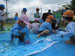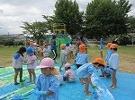 やっと晴れたね。3学年全員で絵の具遊び。大きな紙に思いきり描いたり、
