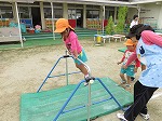 年中・年少は年長に憧れの気持ちをもち、年長はその思いを自信に変えて♡優しく教えたり、譲ったりする姿が見られます。これからも心地よい秋風を受けて、異年齢児とのかかわりを大切に運動遊びを楽しんでいこうと思っています。