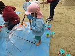 10月14日 キララ商店街と同志社女子大学「たなちる」のみなさんがビニール傘アートを企画してくださいました。傘を見て、「ここに絵描くのー?」と「見てみて!テントみたい!」と製作が楽しみで仕方ない様子でした。