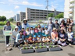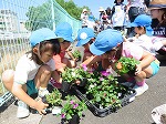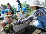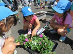 6月9日 京田辺市公共施設サポーター活動(緑化推進事業)で年長ゆり組と有志のお母さん方で、幼稚園前に花の苗を植えました。「自分達の町をきれいにしよう」と話を聞いてからインパチェンスの花を植えました。