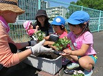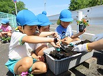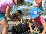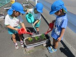 昨年度の年長児が修了記念作品として製作した看板も加わり、幼稚園前が明るくなりました。植えていると、地域の方が「きれいになったなー」「これから水やり頑張ってや」と声をかけてくださり、子ども達の意欲につながりました。これから暑い時期になりますが、お世話を頑張ります。
