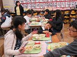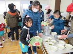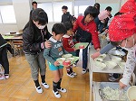 3月13日 年長ゆり組は田辺東小学校に体験給食に行きました。1月にも行かせていただき、今日は2回目です。朝から楽しみにしていました。給食室からおいしいにおいがしてきて「今日の給食おいしそう」「早く食べたいな」とお昼が待ち遠しい様子でした。1年間交流させていただき、小学校に行くことを楽しみにしている子どもたちです。今回も5年生のお兄さん・お姉さんにお世話になりました。