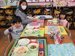 「前やったカレーライスのゲームしたい」「おちゃらかしよう」会話を楽しんで笑顔で食事していました。苦手な野菜もお兄ちゃん・お姉ちゃんに「モリモリ元気になるよ」「おいしいし食べてみたら?」と進めてもらって食べることができました。