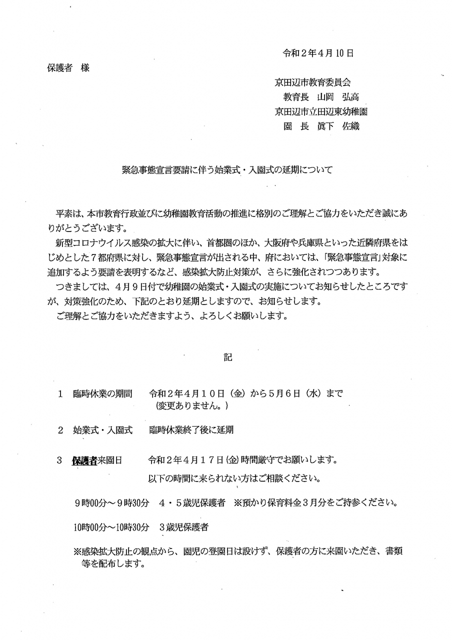 始業式・入園式延期について