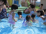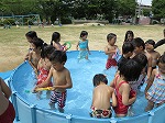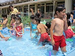 待ちに待った水遊び開始。「うわあ、冷たい」、水の掛け合い、水中走り、おもちゃ浮かべ、しゃがみ込み拾い、水鉄砲での対戦・・・思い切り水を体感した子どもたちです。