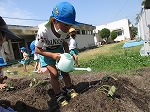 先日、さつまいもの苗を幼稚園の畑に、4歳児すみれ組と5歳児ゆり組が植えました。