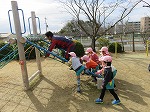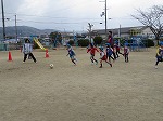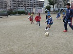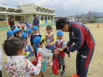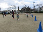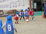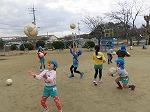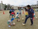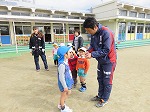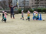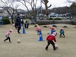 2月21日 雪がちらつく寒い日でしたが、サンガつながり隊のコーチが来てくださり元気いっぱいうんどう遊びやボール遊び、サッカーを楽しみました。