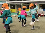 思いきり地面を蹴りつけてドシンドシン大股で歩いたり、ボールをキャッチするまでに何回手をたたけるか…など楽しそうに取り組んでいました。