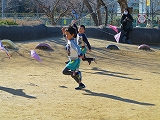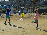 ひもを持って走ると、雲一つ無い空に凧がスイスイ。今年も元気に大きくなあれ!