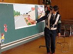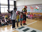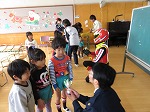 ホールでもう一度みんなでおさらいしました。「今日は来てくれてありがとう」とまつぼっくりのクリスマスツリーをお礼に渡しました。「これからも交通事故にあわないようにきをつけます!」「元気に大きくなります」おまわりさんとヒカルマンに約束しました。