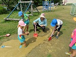 雨上がりの園庭は楽しい遊びがいっぱい!ドロドロのチョコケーキを作ったり、水たまりを池に見立てて遊んだりしました。