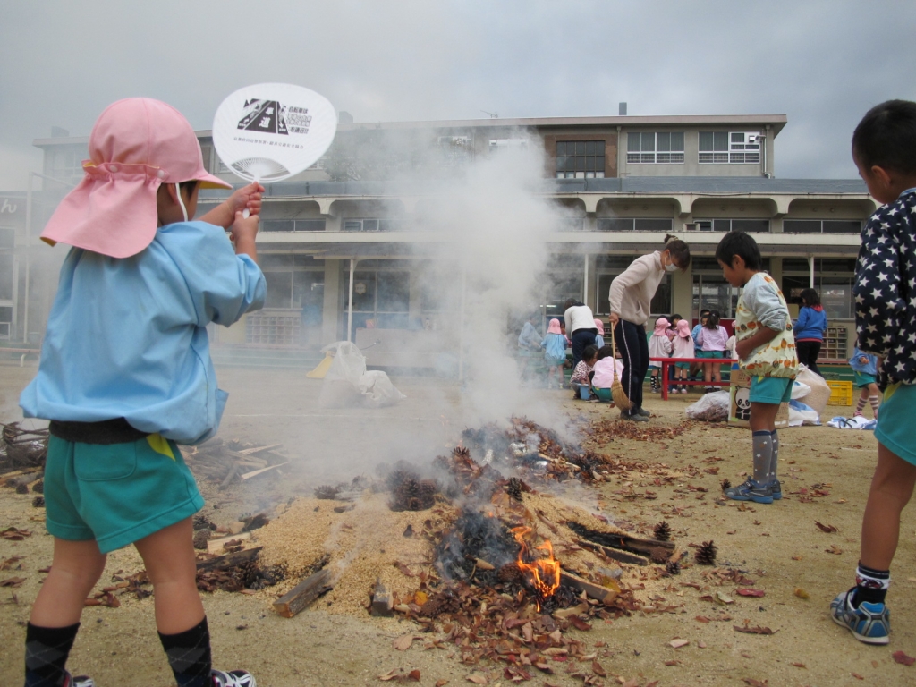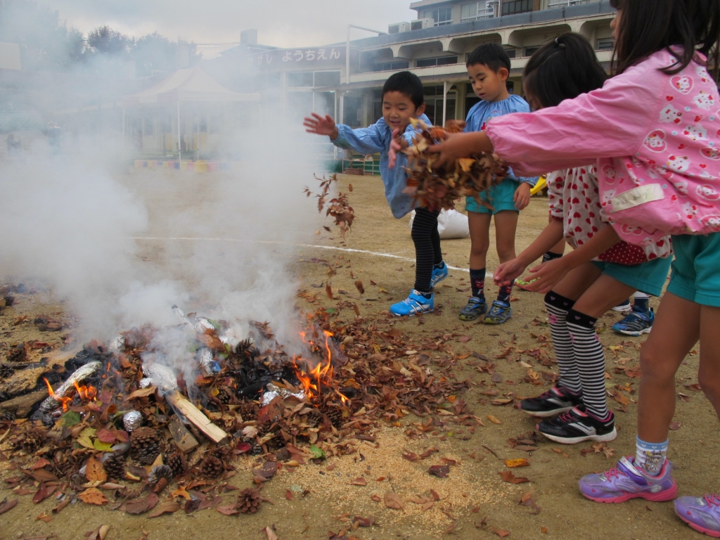 をつくってあおいだり、煙のなかでハンカチ忍者になったり、たきびにあたる