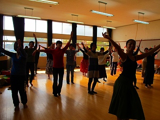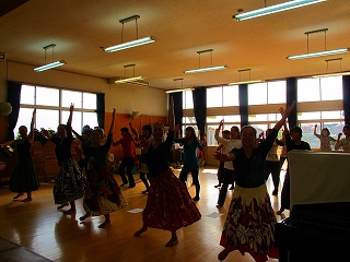 井戸端会議の取り組みでフラダンスにチャレンジのお母さんたち。進んで参加の方も仕方なく参加の方も、とってもいい感じ。若いと動きが違う、のみ込みはやーい!!池田先生と教室の皆さん有り難うございました。