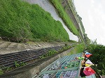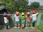 集いの後、ゆり組さんは園の前の川に泳いでいる鯉を見に行きました。