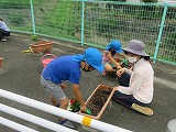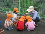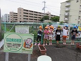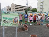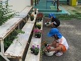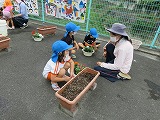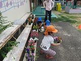 花の苗植えをしました(6月18日) 田辺東幼稚園は、「京田辺市公共施設サポーター」として、幼稚園前緑地を管理しています。(花を植えたり、掃除をしたりしています。) この日はゆり組・すみれ組の子どもたちが花の苗植えをしました。 市役所公園緑地課から届けていただいた花の苗を並べてお花屋さん!それぞれ植えたいお花を選びます。