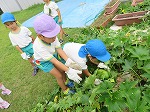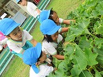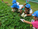 「くるくる回して取るんだよ」と教えてもらいました。「○○くーん!手伝って!」「重たい!手伝って!」大きな冬瓜は予想以上に重たくて、お友達と協力して収穫しました。