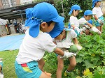 9月4日 年長ゆり組が5月に植えた冬瓜が収穫の時期を迎えました。畑にどんどん這って大きくなる様子を見て「まだとらないの?」「大きくなってきたよ」と毎日、水やりをしながら収穫を楽しみにしていました。先生に「毛がなくなってツルツルになったら収穫できるよ」と教えてもらい、毎日よく見て触って楽しみに待っていました。「先生!ツルツルになったよ!」「取ろう!」喜んで報告してくれました。
