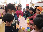 2月28日 子どもお別れ会をしました。前日、年中すみれ組が「いつもありがとう。おわかれかいをします。きてください」と年長ゆり組に招待状を持っていきました。