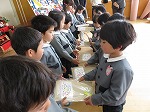 そして心を込めて作ったプレゼントも手渡しました。うさぎ組は野菜スタンプをしたクリップボード、すみれ組は切り紙でお花を作ったファイルをプレゼントしました。