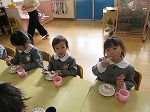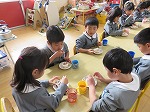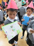 一人一人サンタさんからプレゼントをもらい、嬉しそうでした。お礼に歌とまつぼっくりツリーのプレゼントをしました。サンタさんと♪あわてんぼうのサンタクロースを歌い、大きく手を振ってサンタさんは帰っていきました。