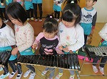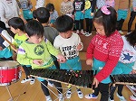 年長さんが楽器を教えてくれました。「こうやって鳴らすねんで」「そうそう。じょうず~」優しく教えてくれ、年少・年中さんも憧れの楽器を経験し、とっても嬉しそうでした。