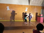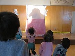 年長が劇の中でした影絵がどうしてもしたい年少さん。先生と影絵遊びも楽しみました。「うわぁー大きい」「みて!みて!犬みたい」と喜んでいました。新しい発見を楽しみました。