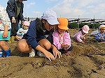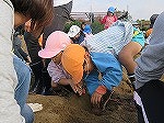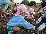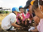 「ほら見て!」「お芋出てきた~」「大き~い」「一緒に掘ろう!」次々顔を出すお芋に大喜びの子どもたちでした。土の感触を味わいながら手で力いっぱい掘りました。