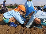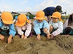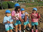 11月9日 子どもたちの豊かな体験のために、地域の方が世話をし、毎年東区の畑でお芋掘りをさせていただいています。今年もさせていただくことになり、みんなでお芋畑まで歩いていきました。今日は田辺中学校のお兄さん・お姉さんが職場体験に来てくれ一緒にお芋掘りを楽しみました。