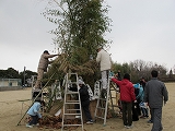 櫓の組み立て。年男と年女の小学生たちが点火。前日にした年長組の