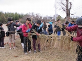 ふるさと体験学習。小学生は繩を綯ってはかま作り。地域の方々は